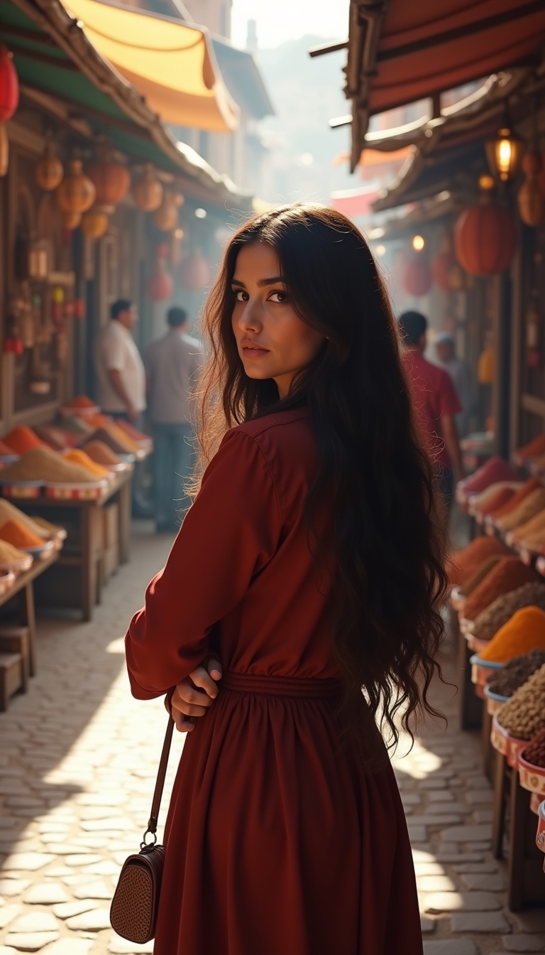 "long dark brown wavy hair visible flowing over shoulders" zorla ekleniyor